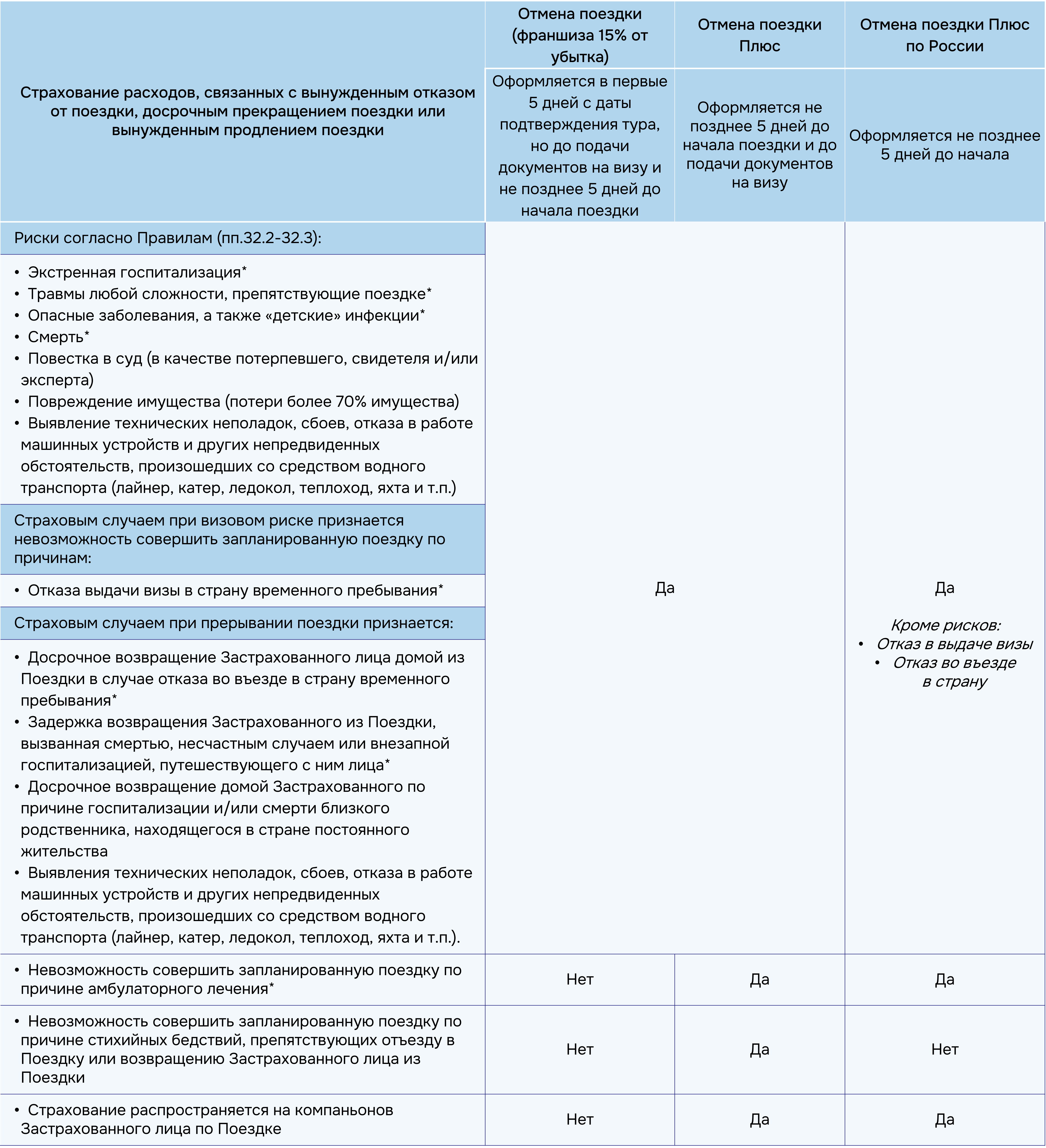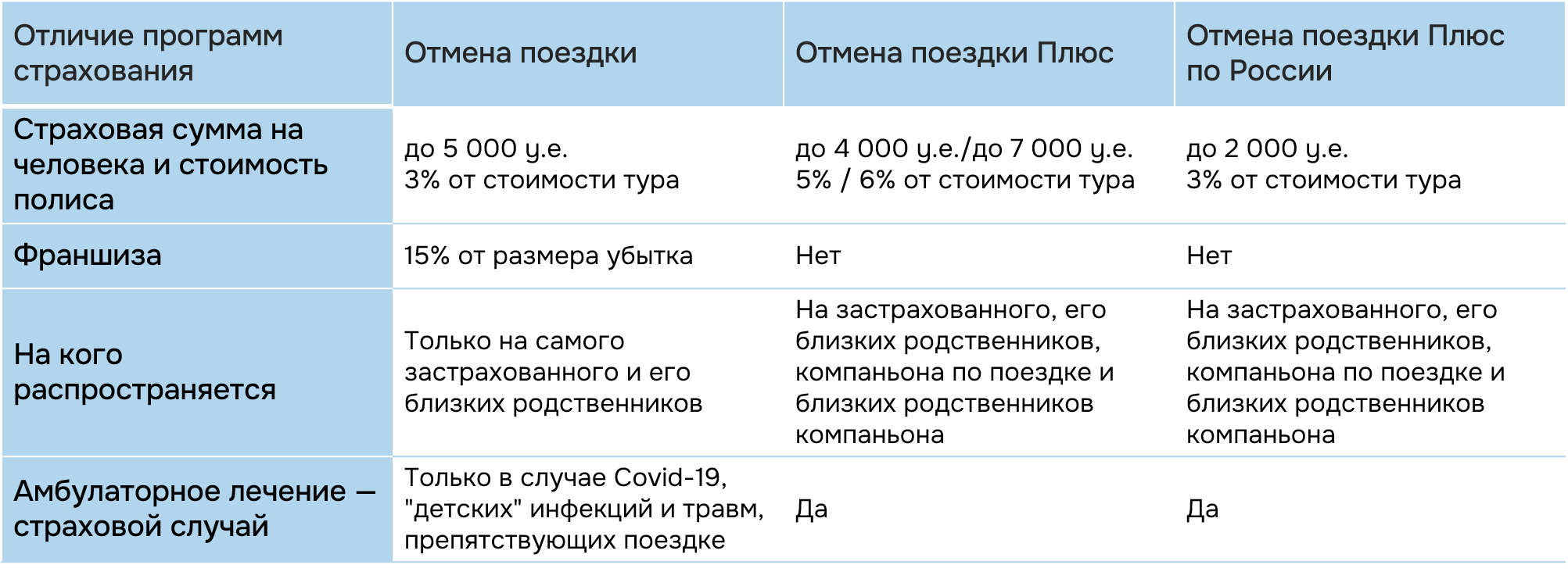 Страховая сумма (стоимость тура) не должна превышать 5 000 евро на 1 человека по программе «Отмена поездки», 7 000 евро на 1 человека по программе «Отмена поездки Плюс» и 2 000 евро на 1 человека по программе "Отмена поездки Плюс по России". При оформлении полиса в эту сумму можно включить как стоимость пакетного тура, так и отдельных услуг (проживание, транспортные билеты, визовые сборы).