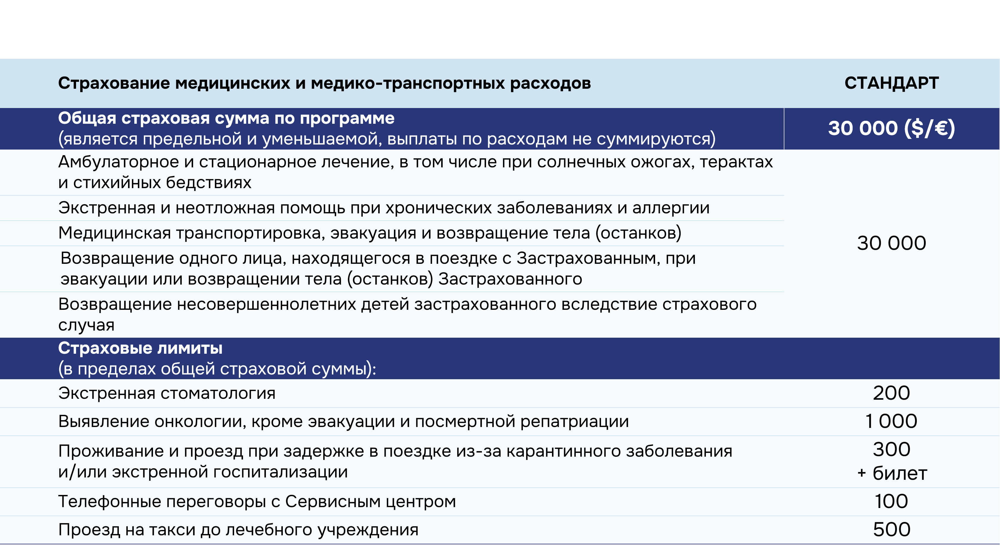 Для поездок только по России можно оформить программу страхования «Экспресс Плюс» со страховой суммой 500 000 руб. на медицинские и медико-транспортные расходы + 300 000 руб. по рискам от несчастного случая.