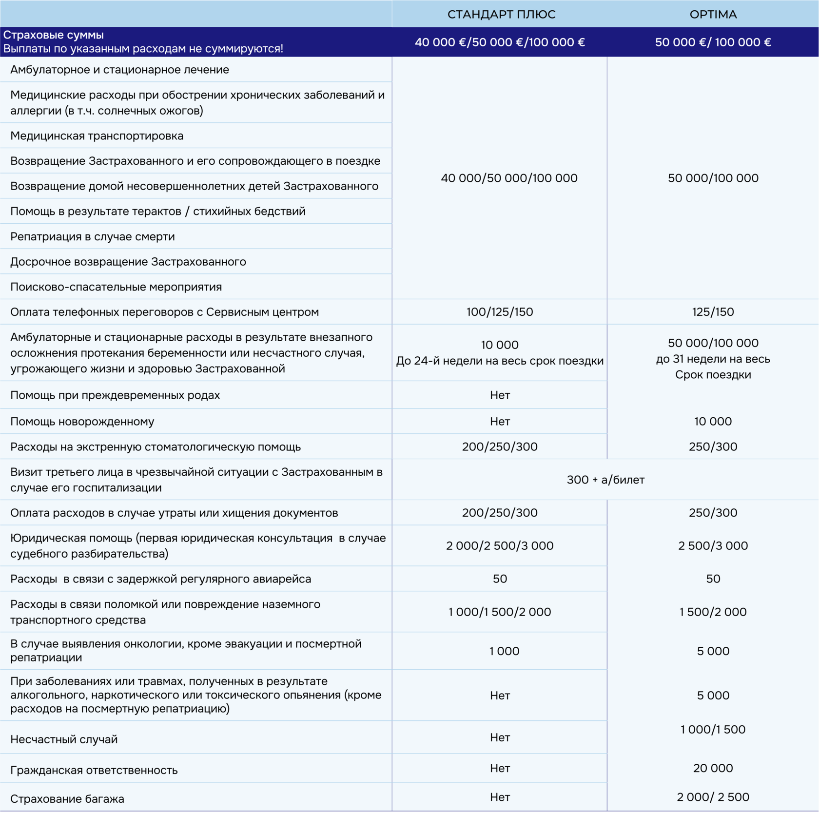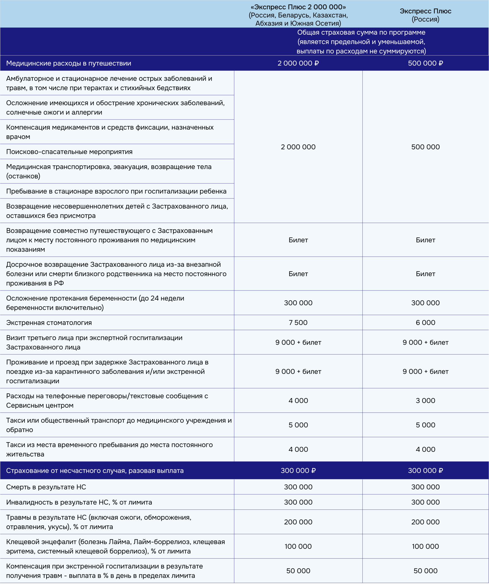Для поездок по России, а также в Беларусь, Казахстан, Абхазию, Южную Осетию (Т-III) можно оформить только программу «Экспресс Плюс» со страховой суммой 2 000 000 руб. на медицинские и медико-транспортные расходы + 300 000 руб. по рискам от несчастного случая.